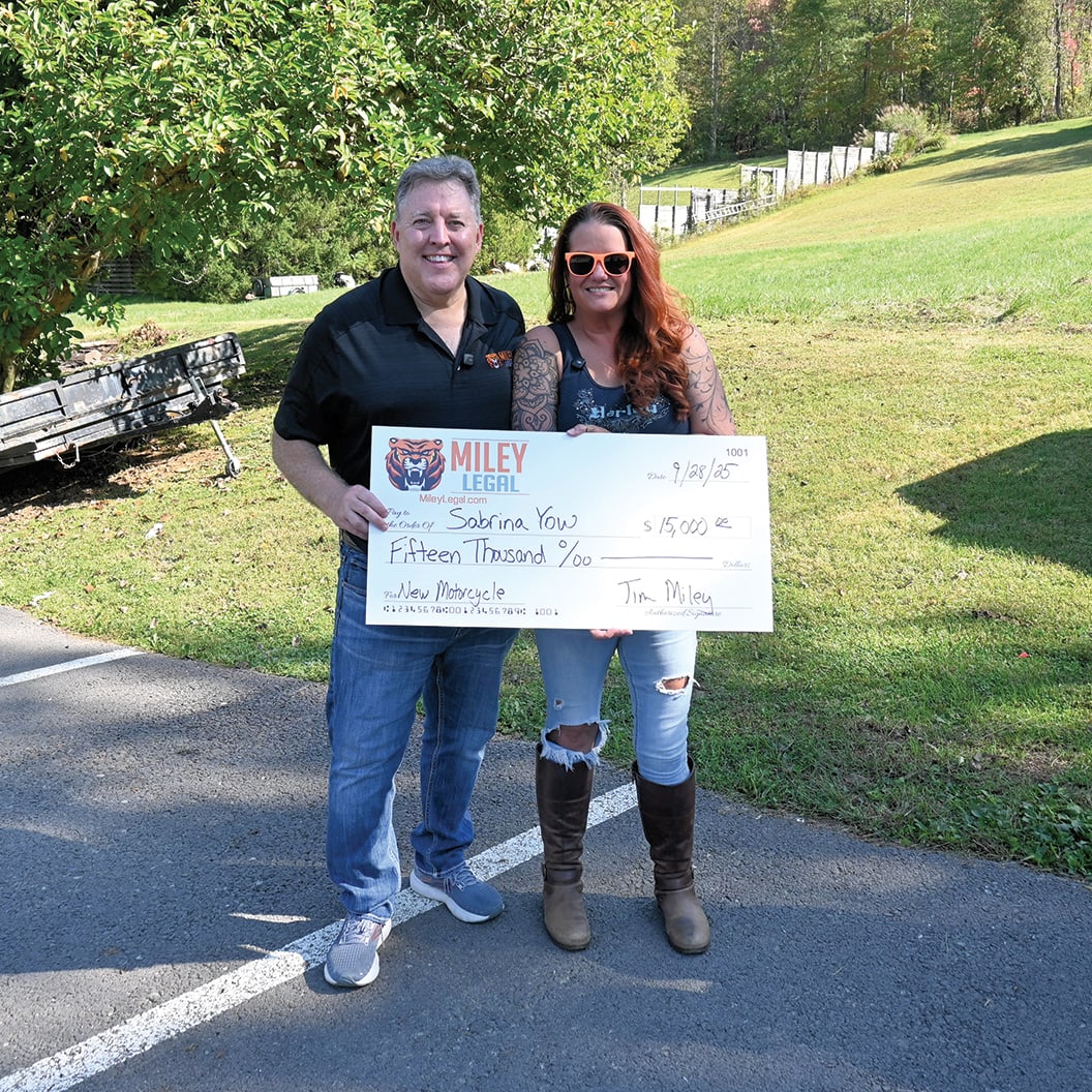 At biker events throughout the riding season, participants can enter the Miley giveaway—one entry per event. The drawing for the grand prize comes at a finale event. The winner then chooses a bike at their favorite dealership, where Miley sends the check. In 2025, the drawing—from 2,583 total entries—was held Sept. 28 at The Social Tap and The “O” by Oliverio’s in Bridgeport, West Virginia.